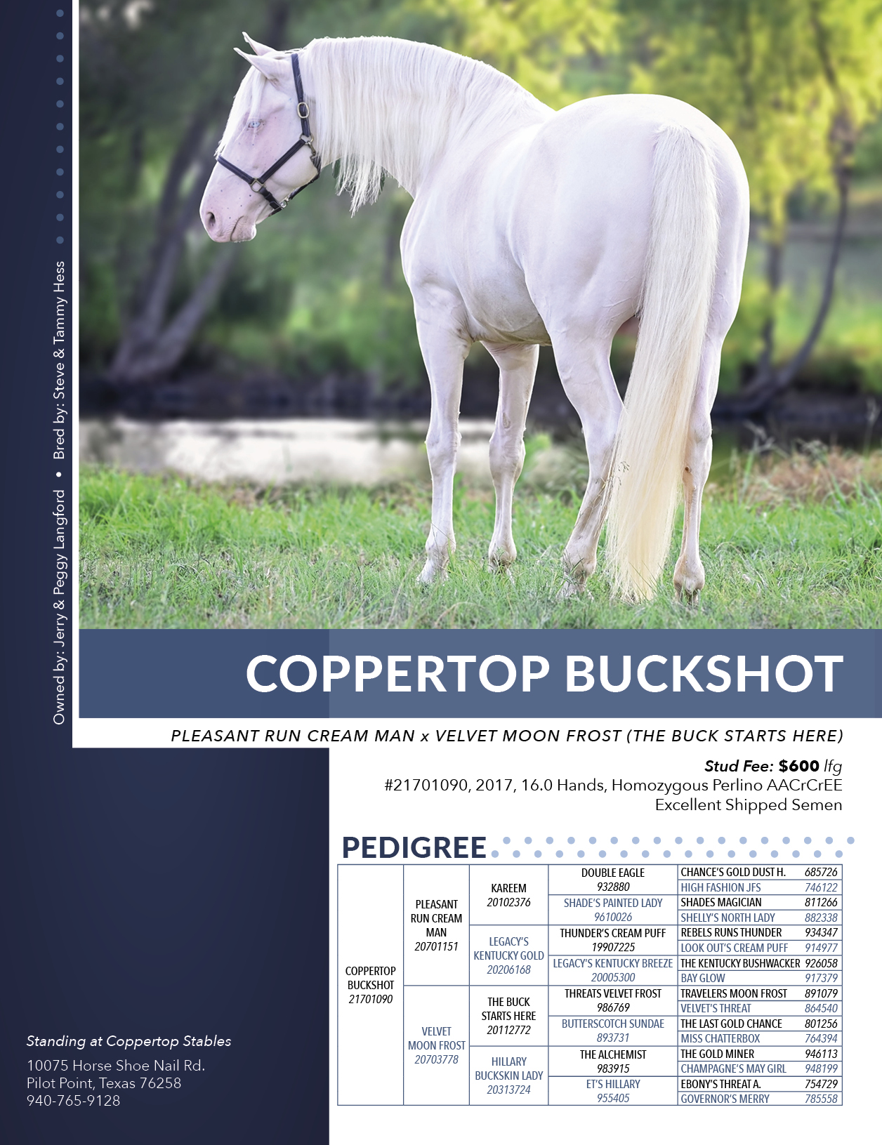Jerry & Peggy Langford. Standing at Coppertop Stables;10075 Horse Shoe Nail Rd., Pilot Point, Texas 76258; 940-765-9128