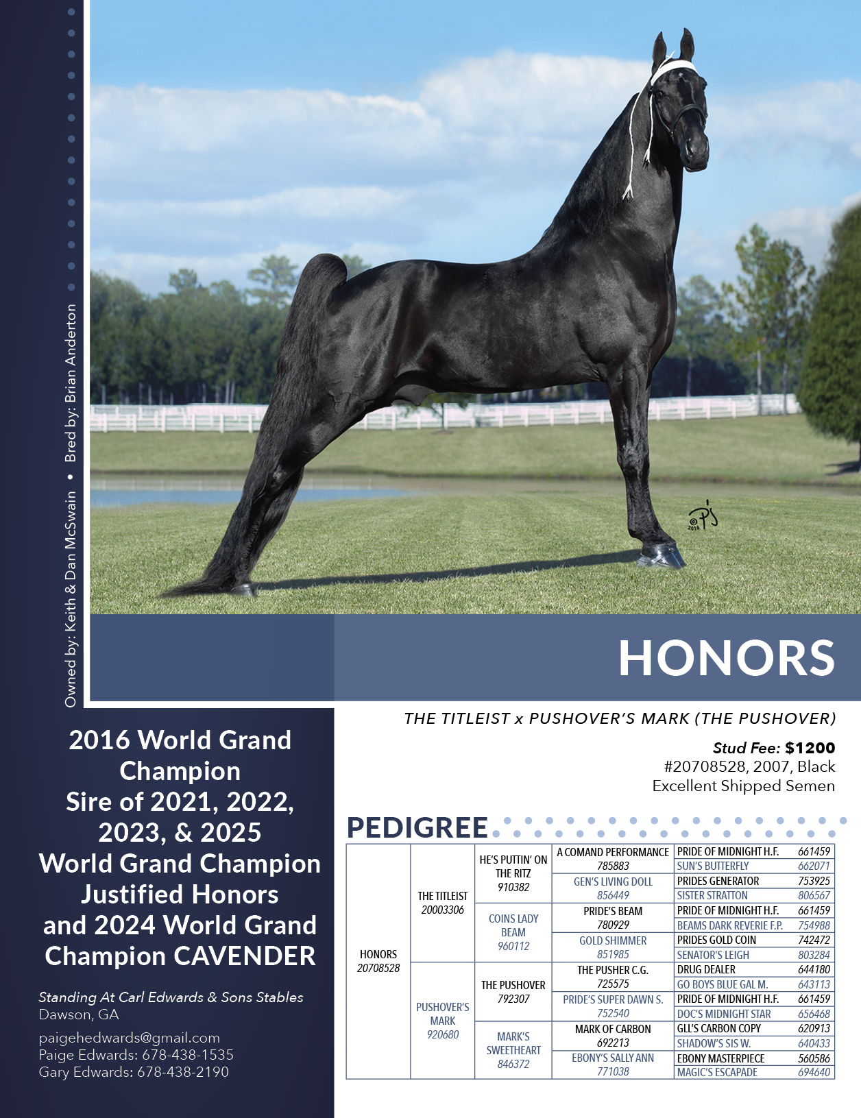 Color: BL; Owned by Dan and Keith McSwain. Standing at Carl Edwards and Sons Stables, Dawson, GA; Paige Edwards cell: 678-438-1535; Gary Edwards cell: 678-438-2190; email: paigehedwards@gmail.com