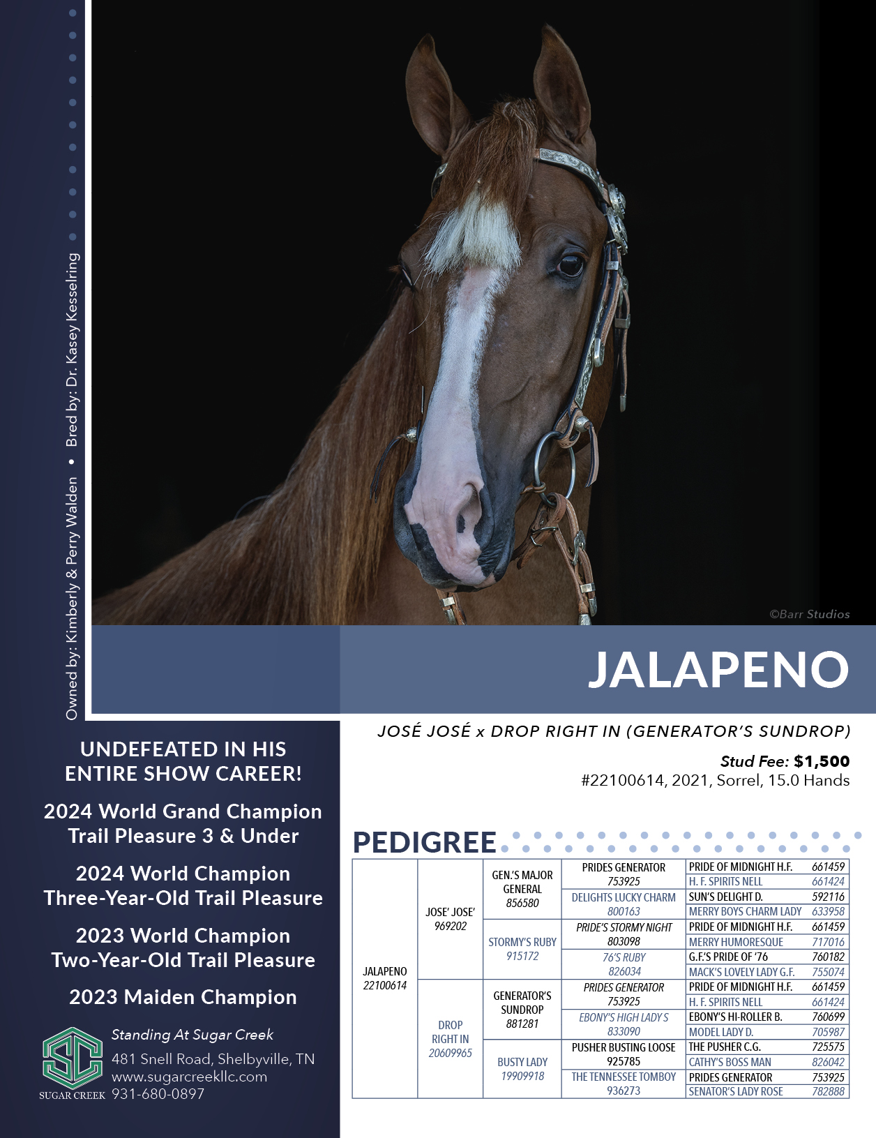 Color: SO; Owned by Kimberly & Perry Walden. Standing at Sugar Creek; 481 Snell Road, Shelbyville, TN; 931-680-0897;