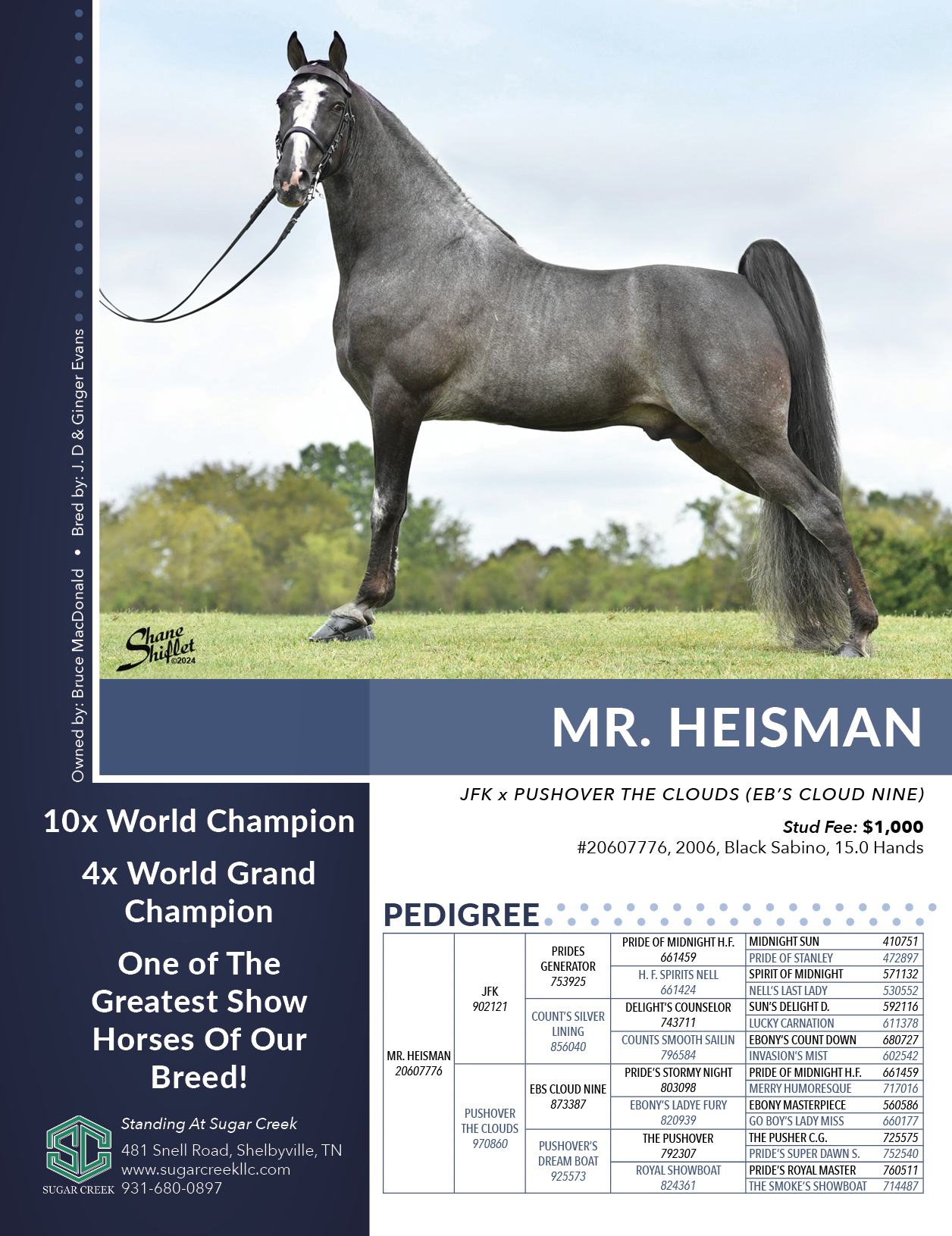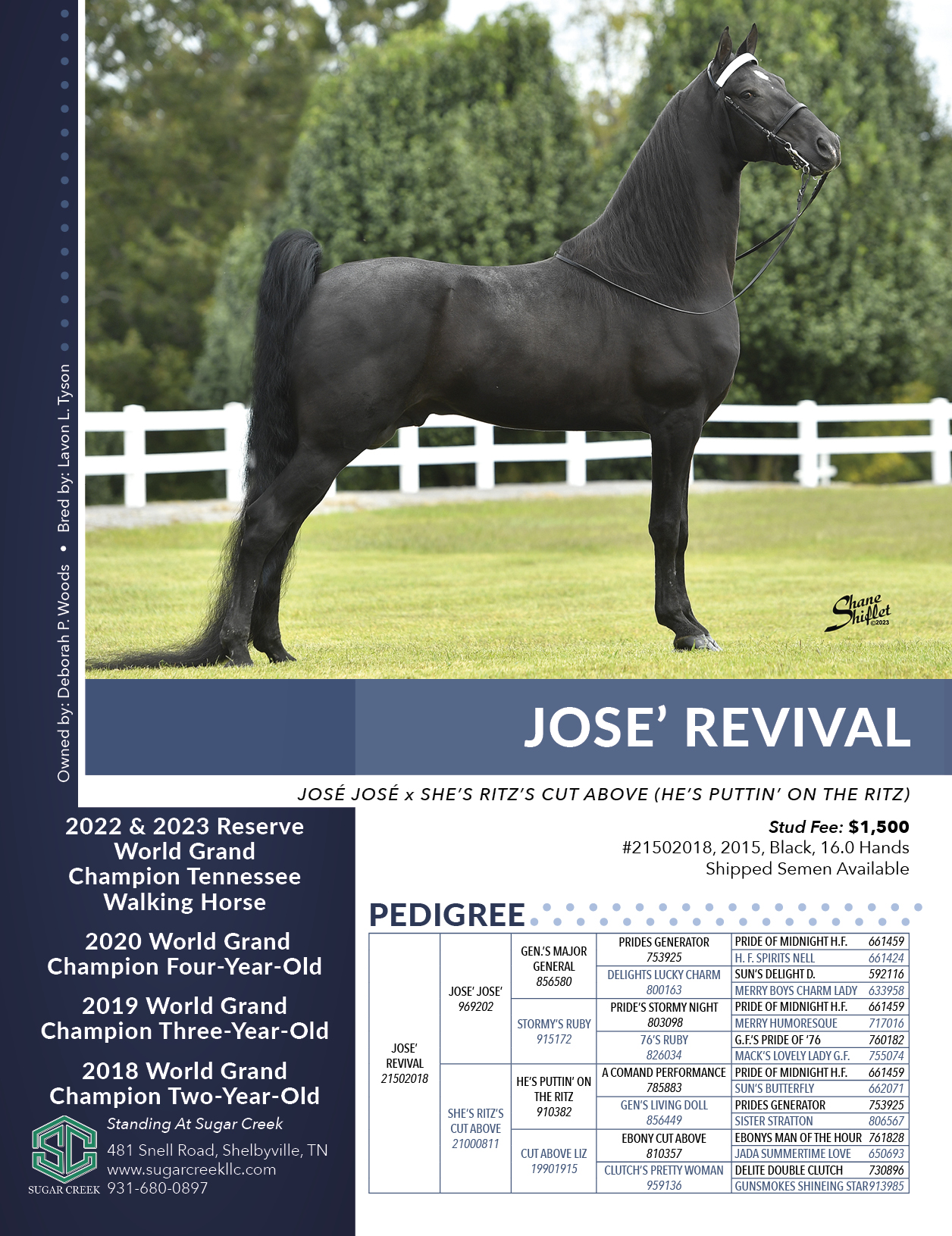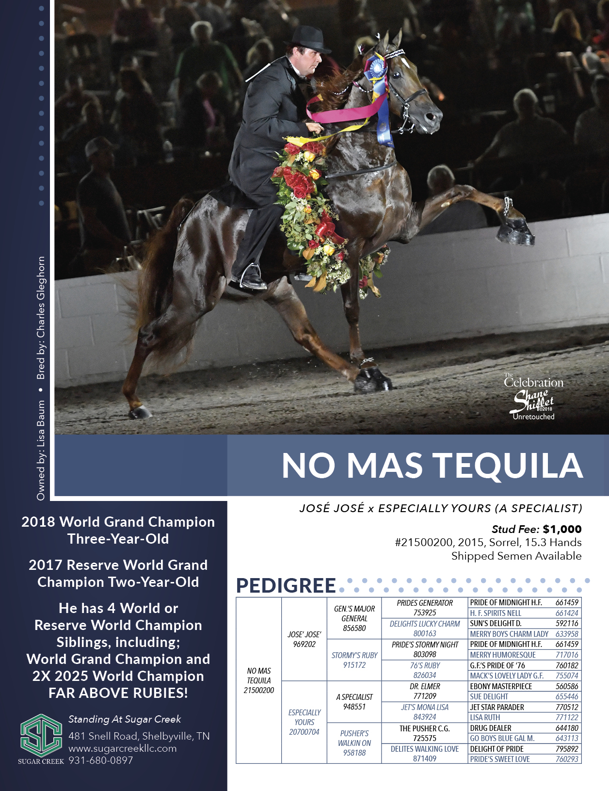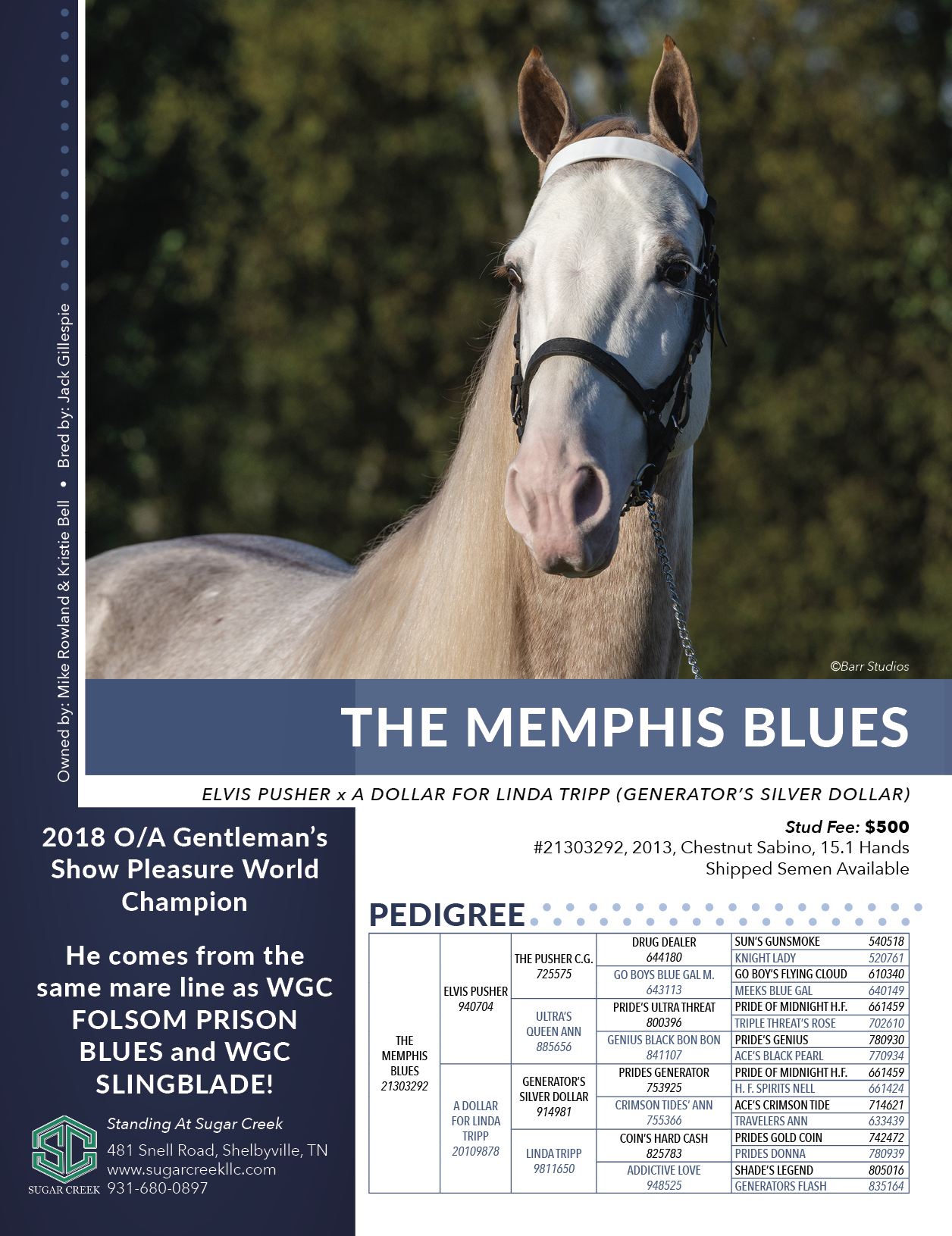 Color: BL; Owned by Billy and Deborah Woods. Standing at Sugar Creek; 481 Snell Road, Shelbyville, TN; 931-680-0897; website: www.sugarcreekllc.com