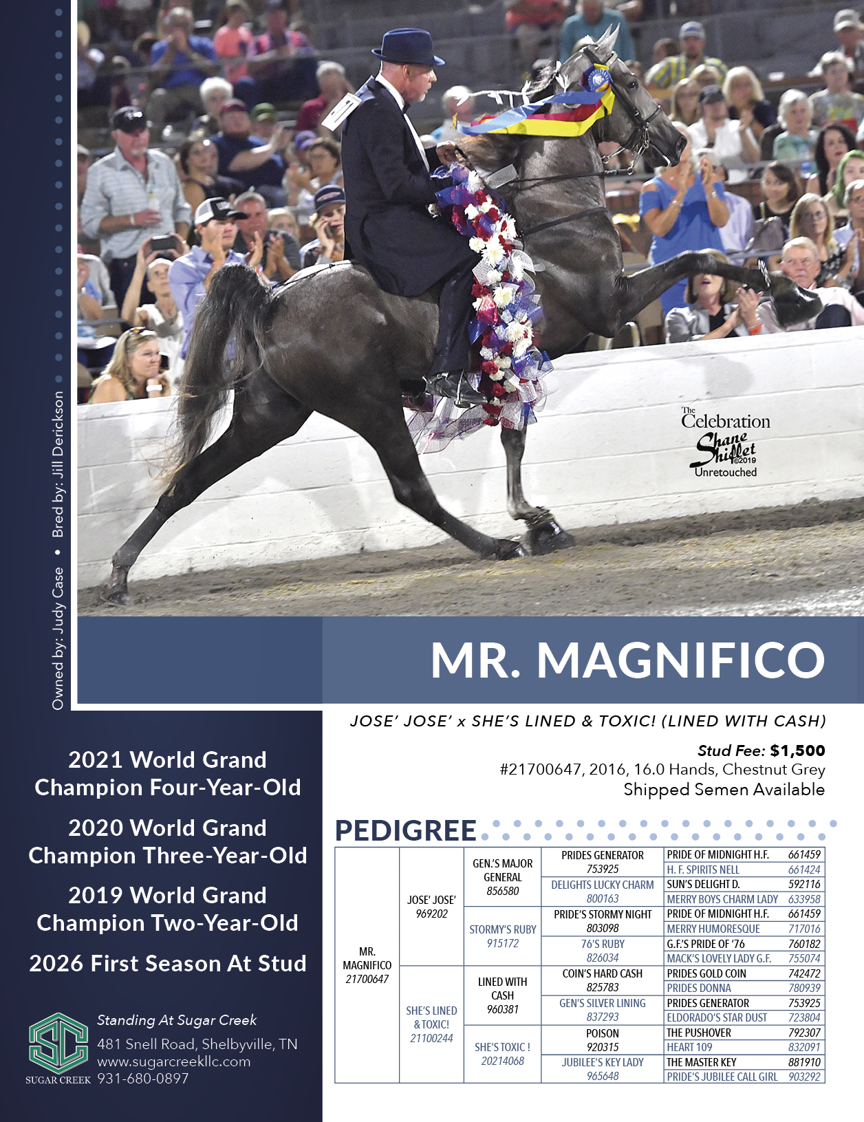 CH; Owned by Five Star Stallions. Standing at Sugar Creek; 481 Snell Road, Shelbyville, TN; 931-680-0897; website: www.sugarcreekllc.com